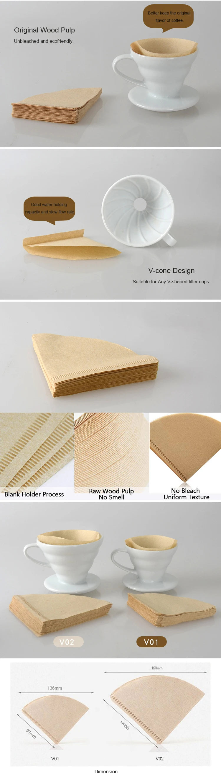 - MATERIAL: Coffee Filters are made of natural wood pulp. No added fluorescent substances, no pigment bleaching, thus reducing the destruction of the original taste of coffee.