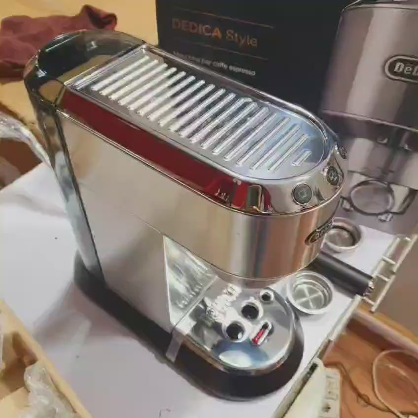 Stylish and compact coffee machine designed to complement your kitchen worktop. With its stainless steel body and shiny metal finish, the Dedica espresso maker adds a touch of authentic Italian design to any kitchen. Enjoy a rich, smooth Espresso and use the Adjustable Cappuccino System to steam milk or finish your coffee with creamy milk foam.