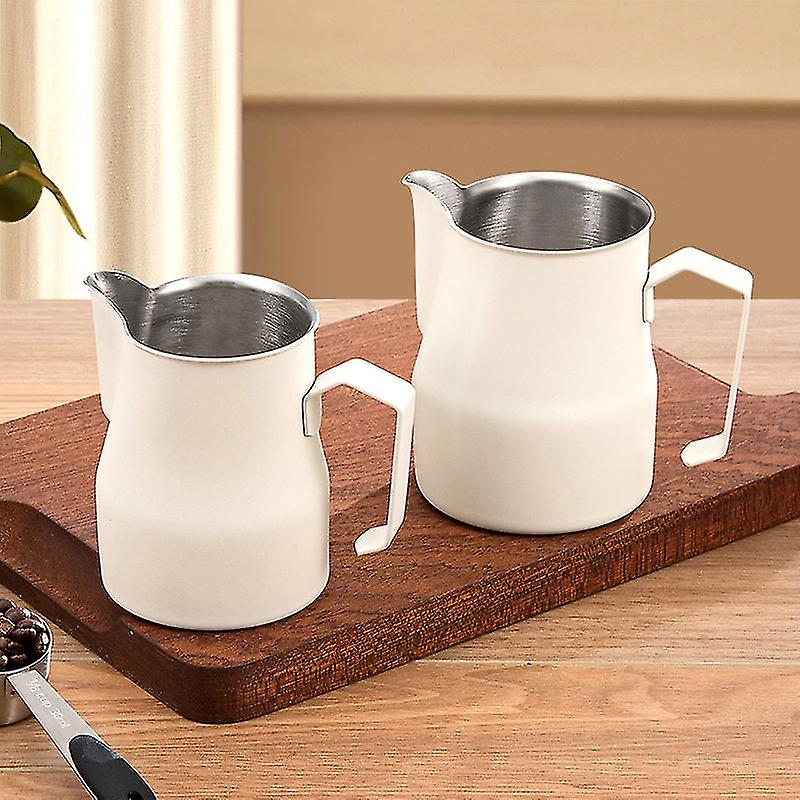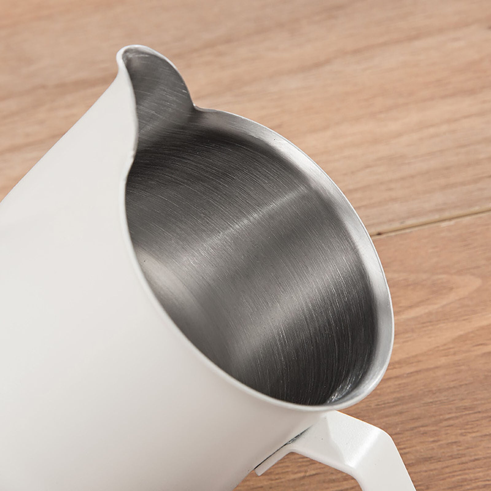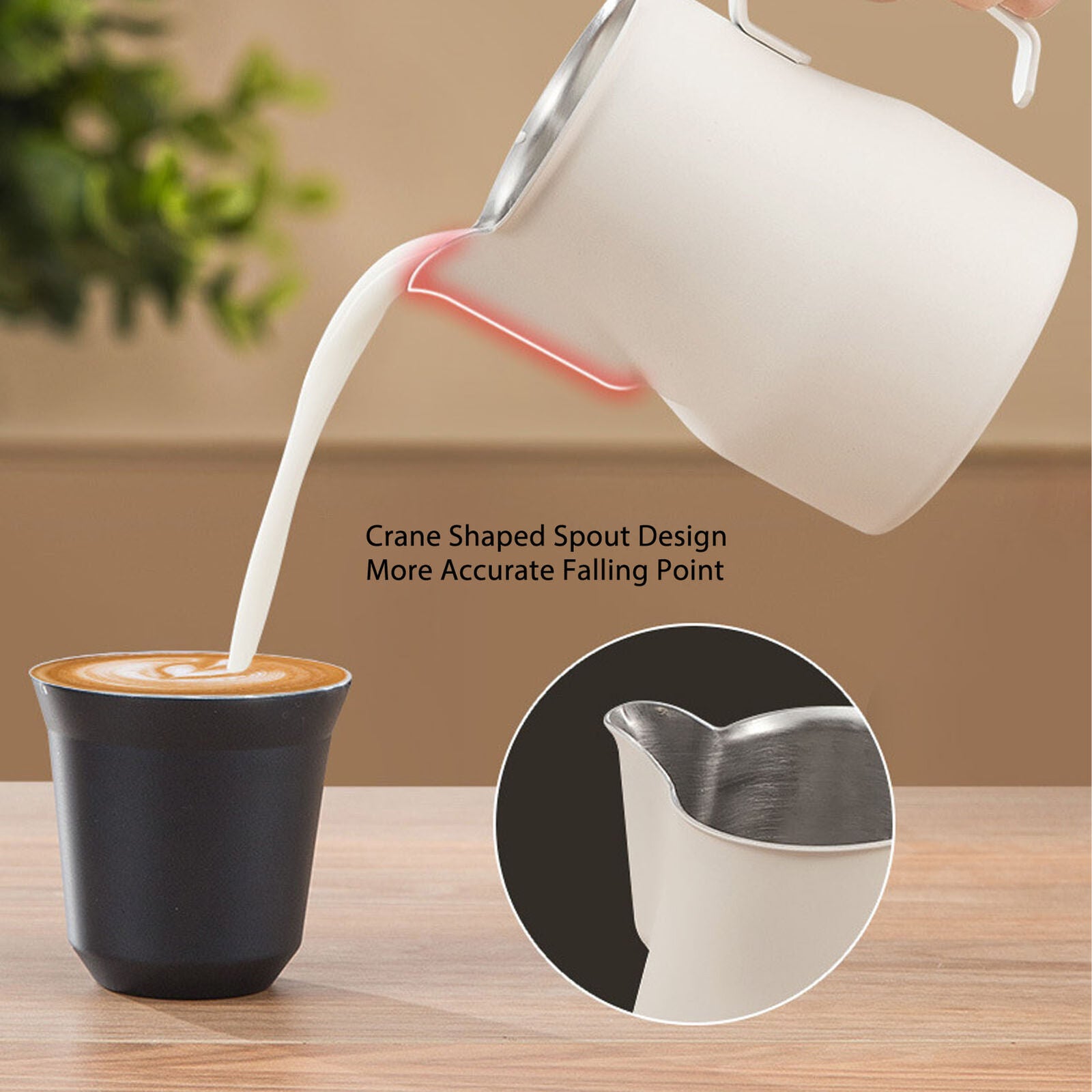 This thin-necked, large-bellied milk frother cup makes it easier to froth and its beak design makes milk froth less likely to spill when you pour the milk.