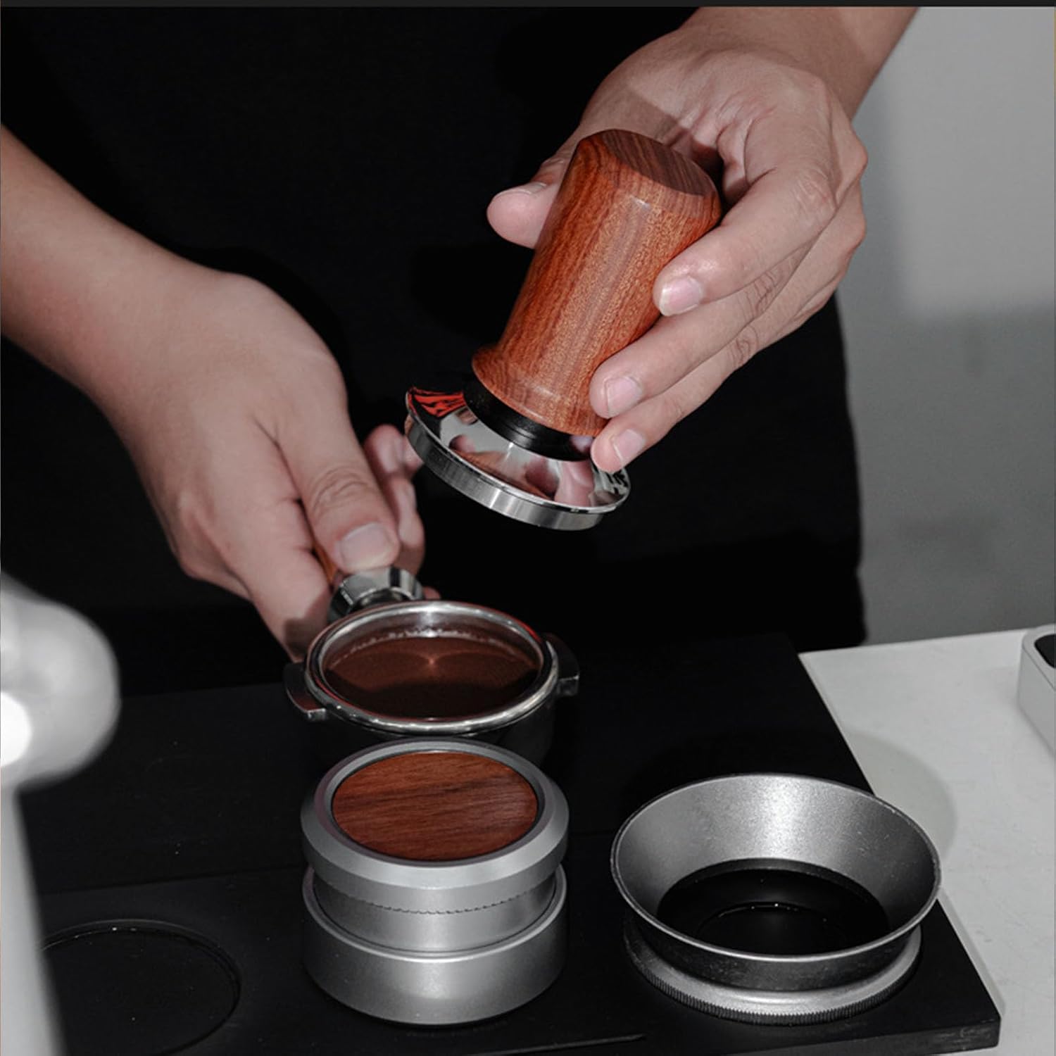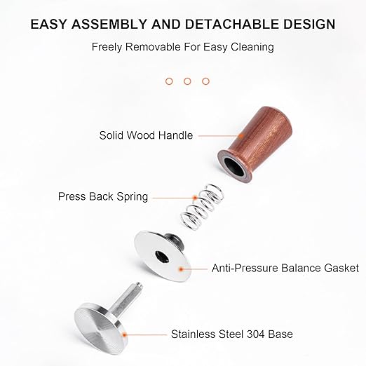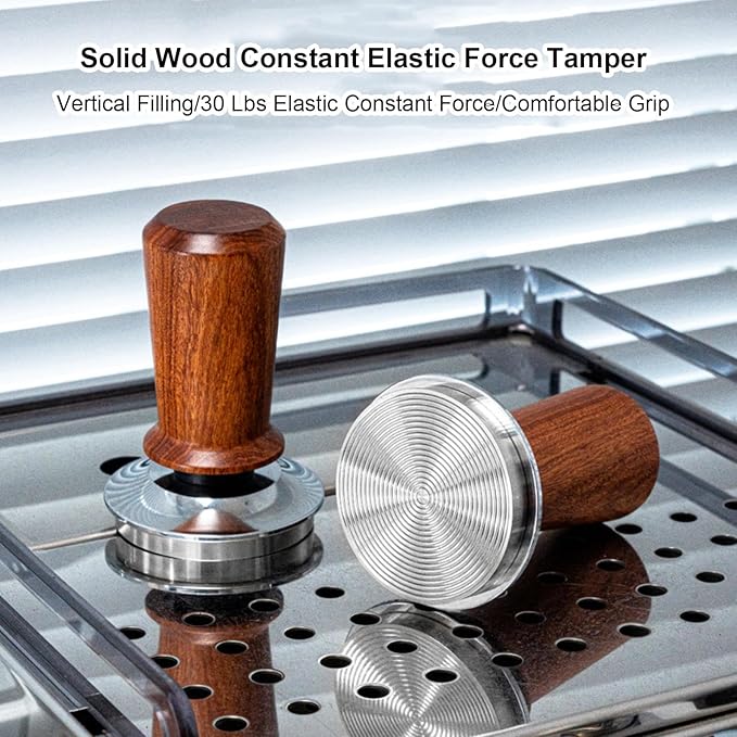 - 30 lbs contact pressure: the tamper pressure regulating has a double spring structure that provides a constant pressure of 30 pounds. A constant and even pressure is applied to the portafilter. Reduces side channelling and avoids poor-tasting espressos